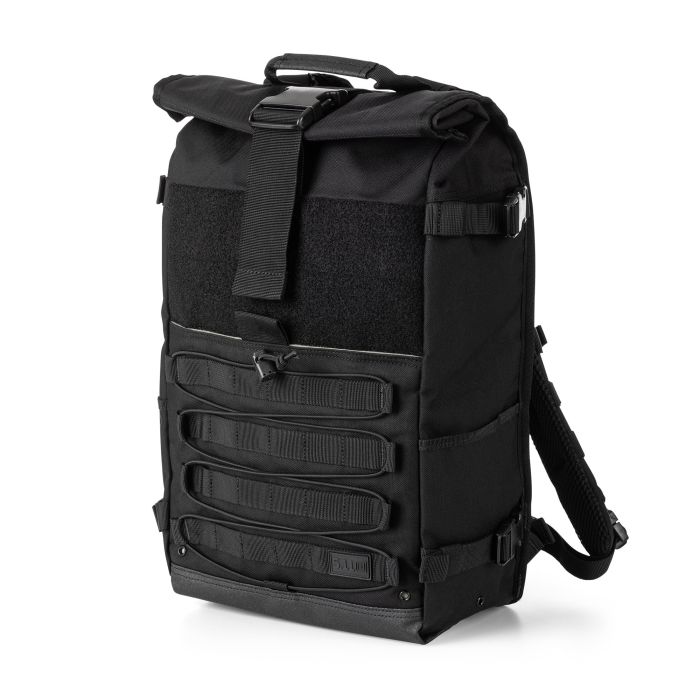 The front of the pack features a MOLLE panel with adjustable bungee retention, a loop panel for your patches. Sides of the pack feature compression straps and stretch water bottle pockets. More pockets and org on the interior of the pack, plus bottom lashing points and a haul handle on the top round out this roll-top pack.